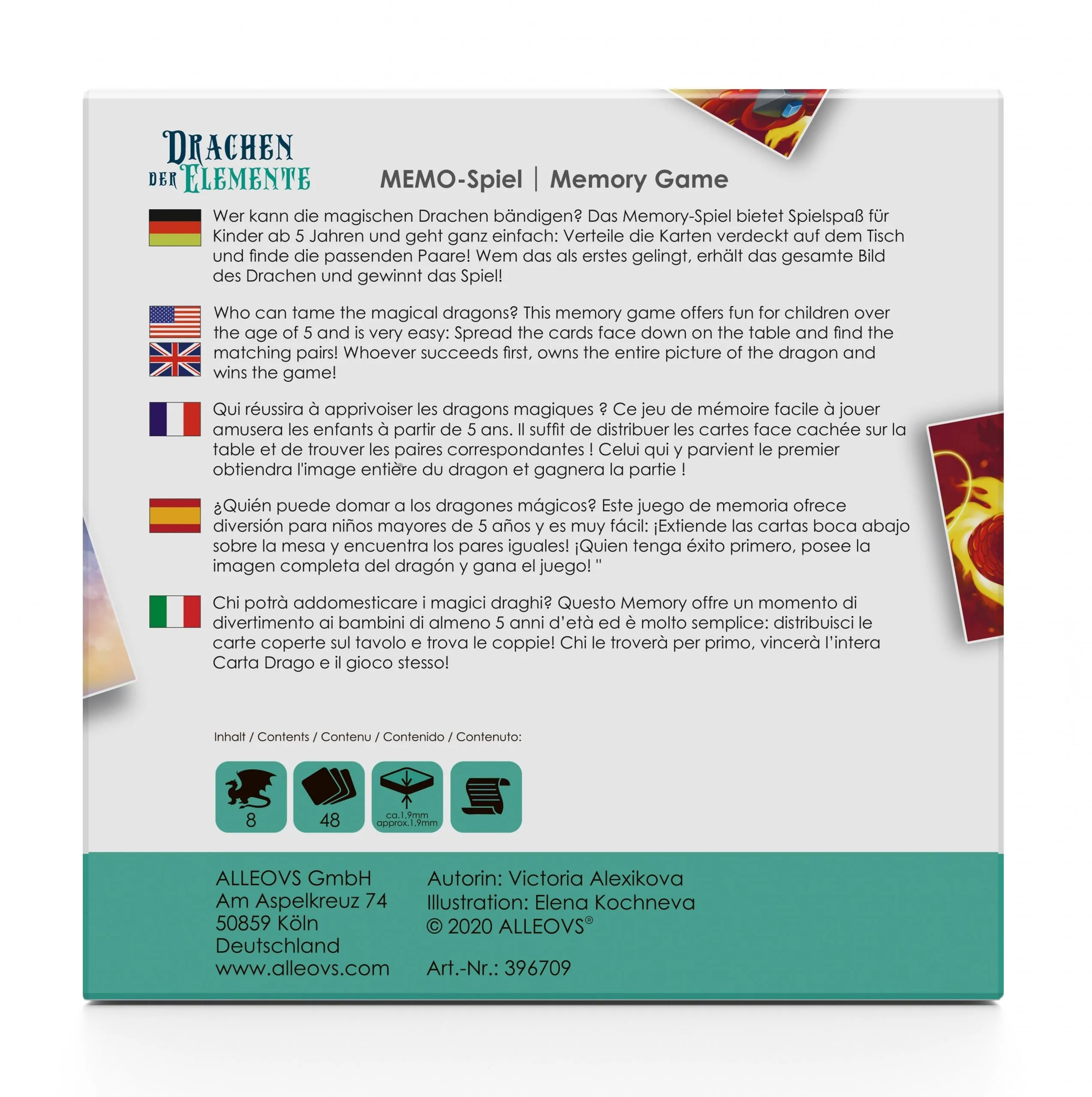 Wasser Drache – Feuer Drache – Erde Drache – Luft Drache – Eis Drache – Metall Drache – Blitz Drache – Nacht Drache. Ein fantastisches Memo-Spiel für die ganze Familie.